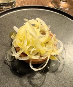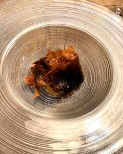 このサーモンが少しレアな火入れで、とても美味しかったです。上にのっていたキャビアのように見えるものは、キャビアではなく別の食材を粒状にしたものだったのですが、説明を受けたのに忘れてしまいました。それでも、このサーモンの火入れが抜群だったことだけは、しっかり覚えています。もう一度食べたいと思う美味しさでした。