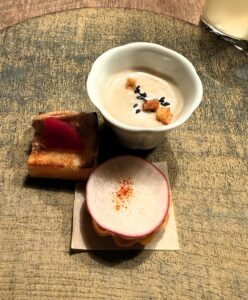 右上のスープは温かくて、さつまいもの旨みがぎゅっと詰まっていました。右下のタルトは、カリフラワーのペーストが入っていて、ラディッシュの食感が楽しい一品。左の自家製トーストは、豚のリエットの旨みがしっかり感じられて、食欲をそそる美味しさでした。