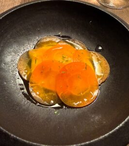 きれいに薄くスライスされた人参の下に、人参のムースが入っていました。味付けはライムでされていてさっぱり。中の人参ムースは濃厚で、人参そのものの味をしっかり感じます。それでいて、ライムで爽やかにまとめられていて美味しかったです。
