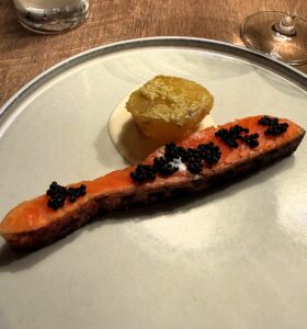 このサーモンが少しレアな火入れで、とても美味しかったです。上にのっていたキャビアのように見えるものは、キャビアではなく別の食材を粒状にしたものだったのですが、説明を受けたのに忘れてしまいました。それでも、このサーモンの火入れが抜群だったことだけは、しっかり覚えています。もう一度食べたいと思う美味しさでした。