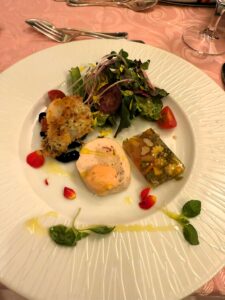 左からイカのフリット、チキンのテリーヌ、右が野菜のゼリー寄せ、上がサラダでした