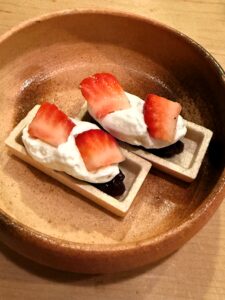 最中の上に餡、生クリーム、いちごがのっていて、いちごもとても大きく、存在感がありました。にしむらさんでクリームを使った甘味をいただくのは初めてだった気がして、少し意外で新鮮でしたが、こちらもやはりおいしかったです。