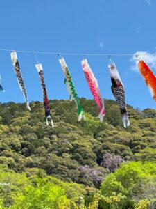 端午の節句が近いこともあって、そばにある東山中学高校には鯉のぼりが泳いでいます