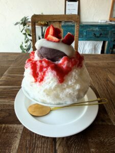 氷の表面には、いちごのシロップがしっかりとかかっていて、どんどん食べ進めたくなります。中にはいちごの果肉白あんホイップも入っていて、まさに「いちご大福」をかき氷にしたような満足感のある一杯でした。ミルクシロップや白あんのミルクシロップも感じられて、甘さはありつつも重たすぎず、最後まで美味しくいただけました。
