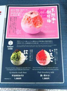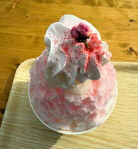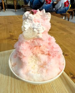 中には桜のクリームと、アイスクリームが入っていてかき氷にもミルクの味がかかっていました