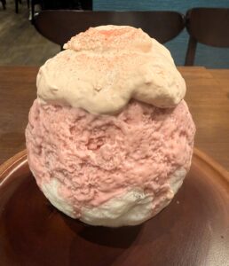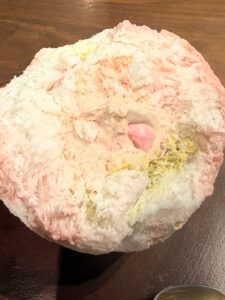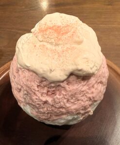 表面には桜のシロップ、ピスタチオのシロップ、ミルクのシロップもかかっています。見た目はかなりピンクで華やかですが、思ったほど重たくはなく、甘すぎる感じもありません。