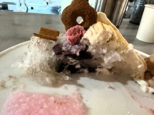 上にのっていたのは、蕎麦ボーロや八ッ橋。ヨリドコロヒヨリらしいふわふわのかき氷に、ともみジェラートのジェラートやさまざまな和菓子素材が重ねられていて、崩すのがもったいないような見た目でした。でも、やはりこれは混ぜながら食べるのが楽しいデザート。かき氷、ジェラート、トッピングを少しずつ合わせながらいただきました。