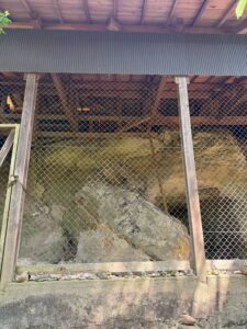 歩いていた林道から外れて、山の中に入るとすぐ先にトタンで囲われた小屋を見つけました。