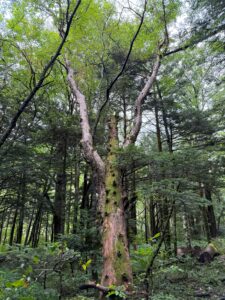 半分倒れた木 周りの木にもたれかかりながらも存在感がありました
