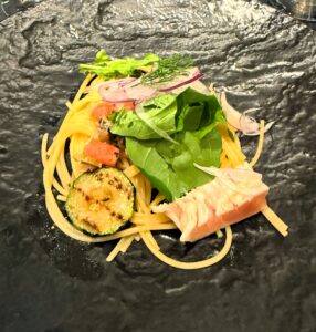ビンチョウマグロとズッキーニのペペロンチーノ フレッシュトマトの冷製プッタネスカソースをかけて