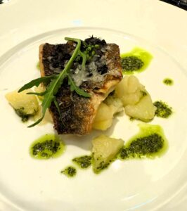 イサキの網焼きとじゃが芋のロースト オリーブタブナードとジェノベーゼ