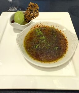 抹茶のクレームブリュレ マンゴーのコンポートと抹茶のジェラート添え