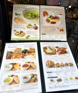 お店の前にはメニューが出ていて、どれにしようかしばらく迷いました。今回は、緑色のスープがとても美味しそうに見えたので、えんどう豆のクリームスープにしました。進々堂のモーニングには、パン(おかわり自由)とドリンクが付くスープブレックファストのようなセットがあり、公式メニューでもこの形式が案内されています。