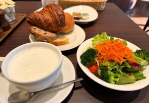 左下がホットミルク、右が追加したサラダ。サラダは野菜が新鮮でシャキシャキしていて、ドレッシングも美味しかったです。追加料金はかかりますが、付けてよかったと思いました。
