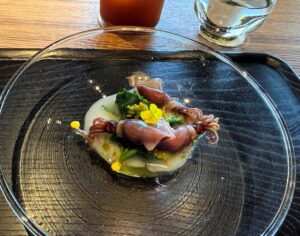 茹でたての蛍烏賊に、お庭のみかんの葉から抽出したオイルをかけ、菜花と合わせ、お米の研ぎ汁を煮詰めたものが添えられていました。とろっとした質感の中に、橙の果汁の酸味がアクセントになっていて、美味しかったです。