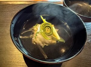 やさしい茶碗蒸しのような印象で、新若芽はとろとろとなめらか。刻まれた蛤も美味しくて、最初の一皿からほっとする味でした。