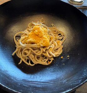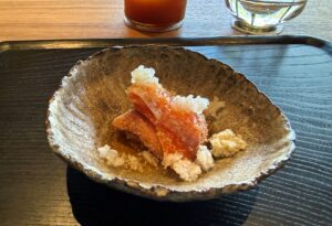 しかも、ただのカラスミではなく、生カラスミと、酵母をかけた熟成カラスミの2種類。食感も香りも違っていて、ひと皿の中で比べながら楽しめました。
