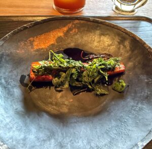 三島産の人参に、一休寺納豆と野草が合わせられていました。人参の素朴な甘みに、納豆の塩気とうまみがアクセントになっていて、面白い一皿でした。