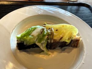 半生でしっとりと火が入っていて、上には炭火焼きした春キャベツ。鰆の骨から取った出汁と、自家製のお酢から作ったソースが添えられていて、火入れが抜群でした。春キャベツの甘さもよく出ていました。