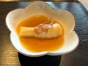 蕗のとう豆腐に、上には大阪・茨木の三島独活。えぐみがなくて食べやすく、お出汁も素材の味を邪魔しないやさしいものでした。節の香りも印象に残りました。