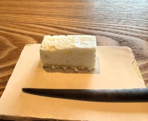使われていたのは「どんか豆」で、桜の葉を使わない桜餅とのこと。お薄と一緒にいただきました。ふわっと溶けるようなお菓子で、不思議な感覚でした。
