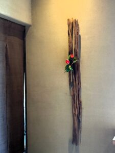 店内では、椿の花と花入が印象的でした。椿はお庭のものだそうで、花入は琵琶湖の木のオールを滝に見立てたものとのこと。