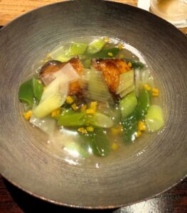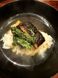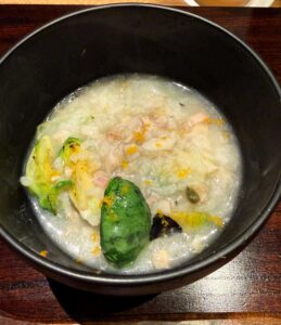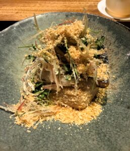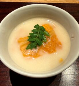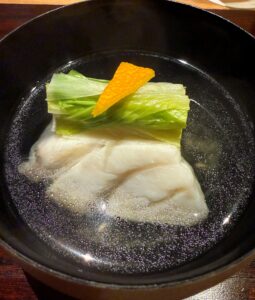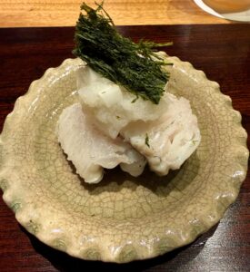 百合根がとても大きくて、ほくっとしていて甘いのが印象的でした。百合根自体には何も味付けしていないそうですが、おやつになりそうなくらいの自然な甘さ。せりとふぐの皮は食感がそれぞれ違って、その違いも楽しかったです。