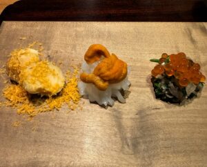 月光百合根とカラスミ、そしてアオリイカ、うに、せり、みぞれ和え、ふぐの皮。