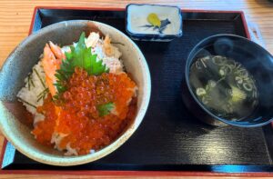 この小屋を運営しているのが、地元の旅館で蟹がおいしいと聞いていたので、ぜいたくに蟹といくらのどんぶりにしました。
