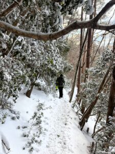 最初の頃はノーアイゼンでしたが、次第に雪も増えてきたので途中でアイゼン装着