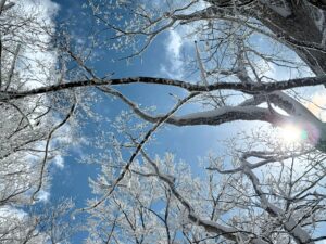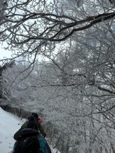 それでも当日は風もそれほど強くなくて、時折見える青空に煌めく霧氷に歓声を上げながら歩きました。