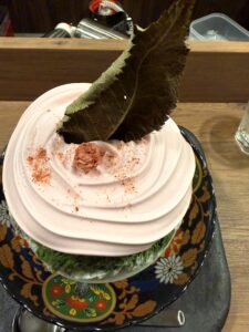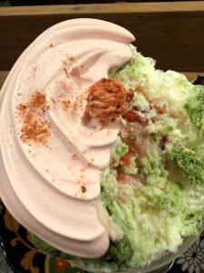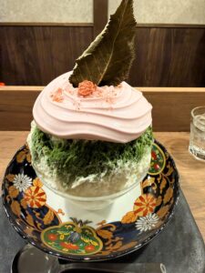 肝心のかき氷は、ふわっとした口当たり。底の方には抹茶のソースがかかっていました。中にはいちごと、道明寺のつぶつぶ、あんこ、乳のソースが入っていて、桜だけで終わらない構成になっていました。